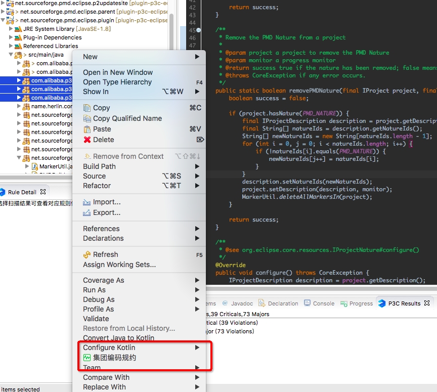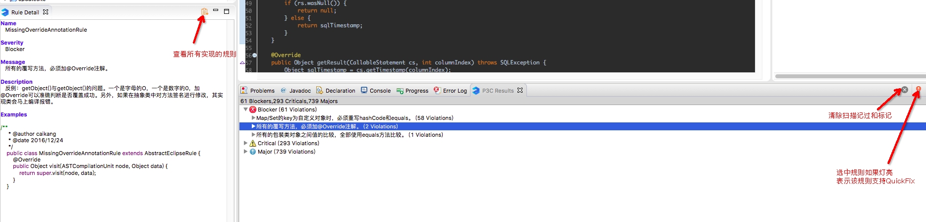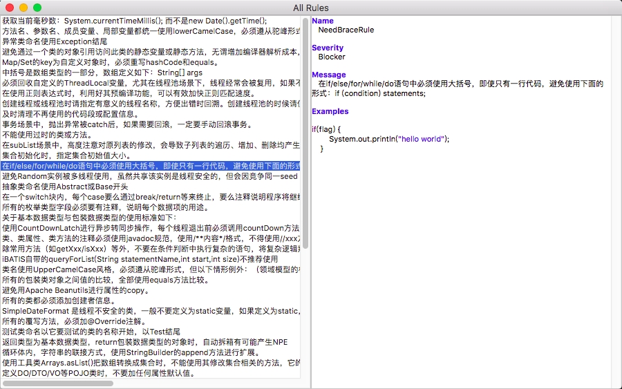 目前插件实现了开发手册中的53条规则,大部分基于PMD实现,其中有4条规则基于Eclipse实现,支持4条规则的QuickFix功能。