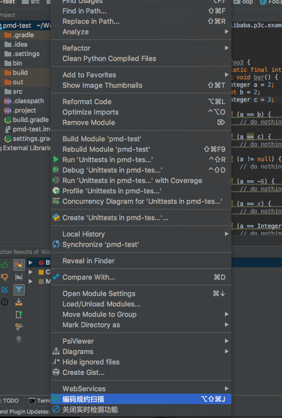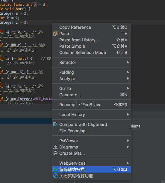 在某些情况下,我们不希望对代码提示违规信息,比如我们在阅读Github开源项目代码的时候,如果界面出现一堆红色、黄色的提示,此时心里肯定是飘过一万只草泥马。这个时候我们可以通过Inspection的设置关闭实时检测功能。 1. 通过右键快速关闭(打开)所有规则的实时检测功能