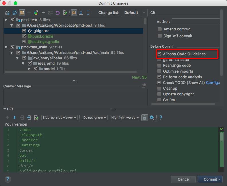 在提交代码框勾选Alibaba Code Guidelines选项