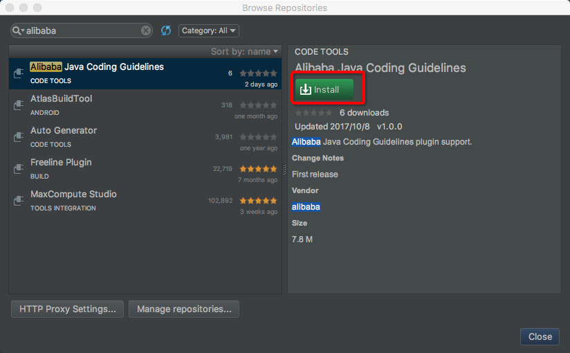 在搜索框输入alibaba即可看到Alibaba Java Code Guidelines插件,点击Install进行安装,然后重启IDE生效